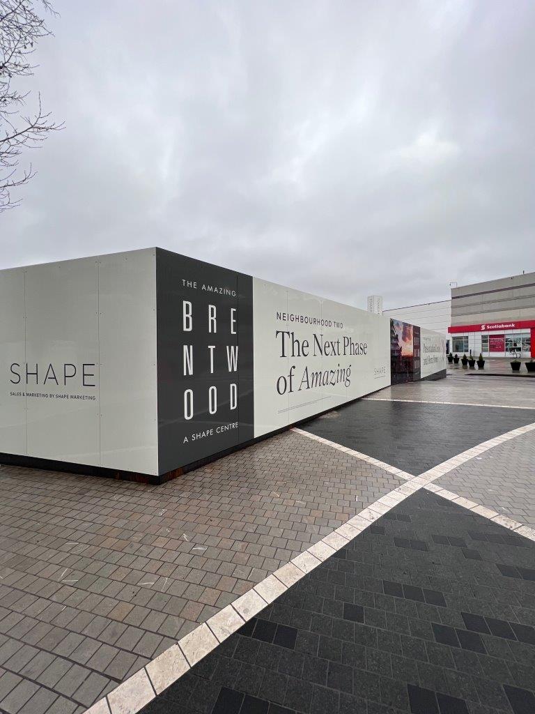 With the construction underway, we were assigned to cover part of the perimeter (facing toward the mall) with custom hoarding graphics. The beautiful hoarding stretches for 400+ feet in length and stands at 8 feet in height. In addition to the hoarding, we also produced a 12ft x 16ft site sign at the corner of Willingdon Avenue and Halifax Street.