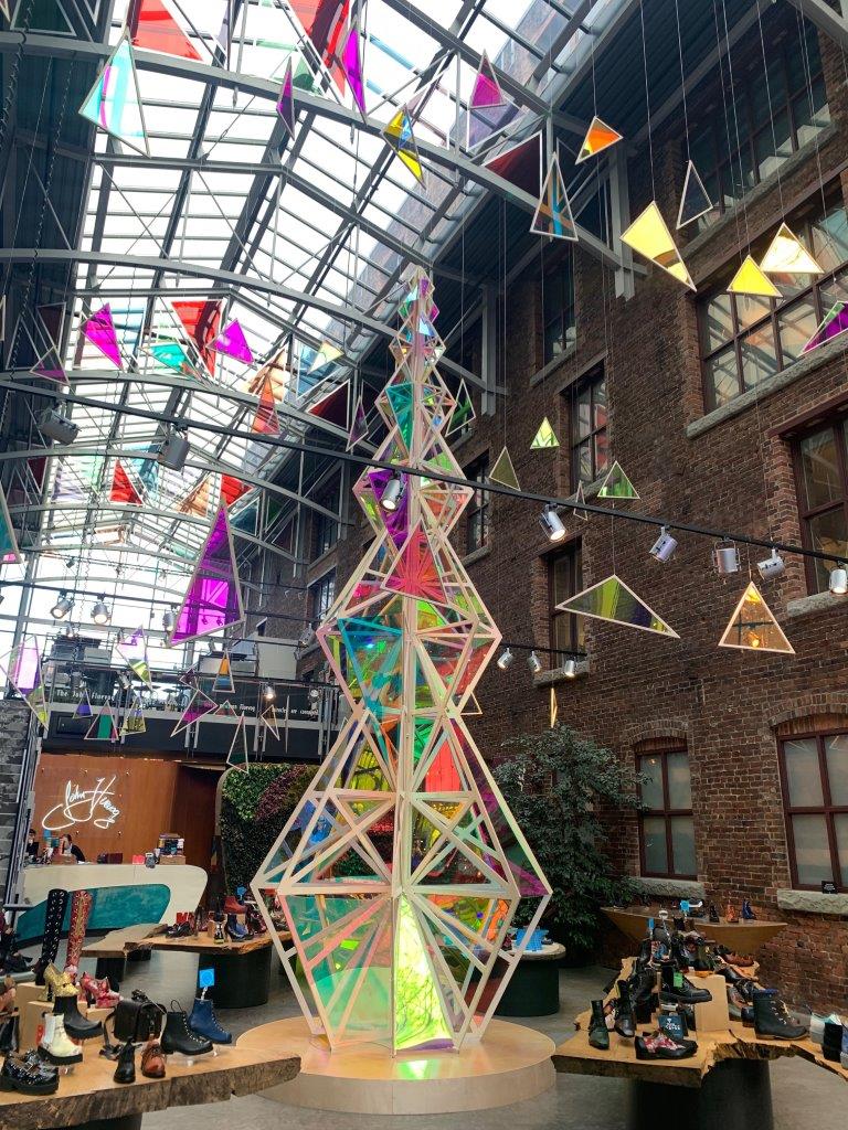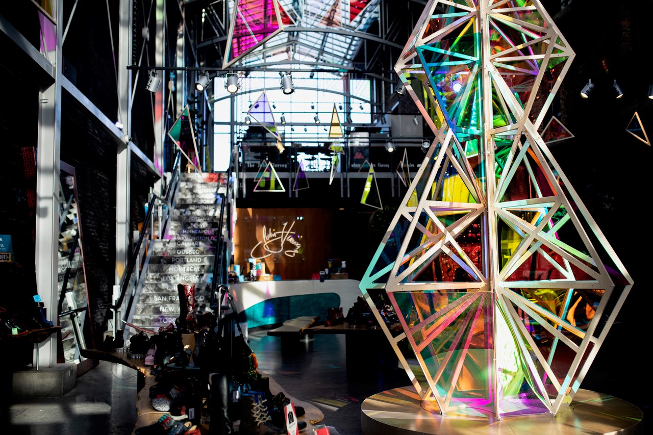 Nestled in a quaint area of Water Street in downtown Vancouver, John Fluevog’s flagship store has an undeniably spectacular holiday display this year. If you visit, you will find a giant 25-foot-tall Christmas tree made up of dozens of Acrylic panels, covered with 3M™ Dichroic Film all assembled on a metal frame. This head-turning reflective design is the brainchild of John Fluevog’s creative marketing team, and it is certainly a sight to behold. It has already created a huge buzz around the city, with many flocking to the store to get a chance to capture that perfect holiday Instagram post.